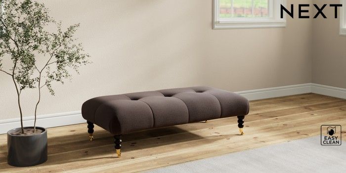7.2.10 Erin Buttoned Back Deep Relaxed Sit Extra Large Footstool Fine Chenille Easy Clean Chocolate Brown High Classic Turned Brass Castor - Dark | Made Click here to use our website with more accessibility support, for example screen readers
