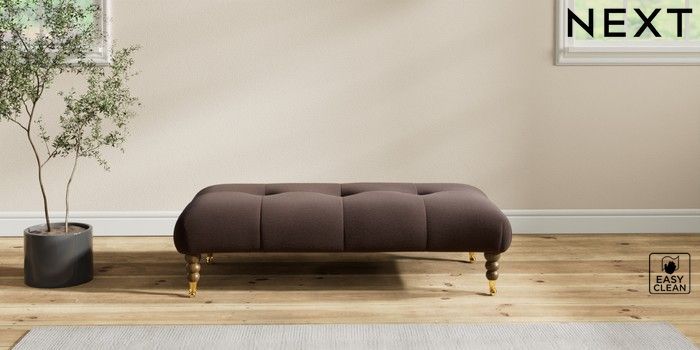 7.2.10 Erin Buttoned Back Deep Relaxed Sit Extra Large Footstool Fine Chenille Easy Clean Chocolate Brown High Classic Turned Brass Castor - Mid | Made Click here to use our website with more accessibility support, for example screen readers