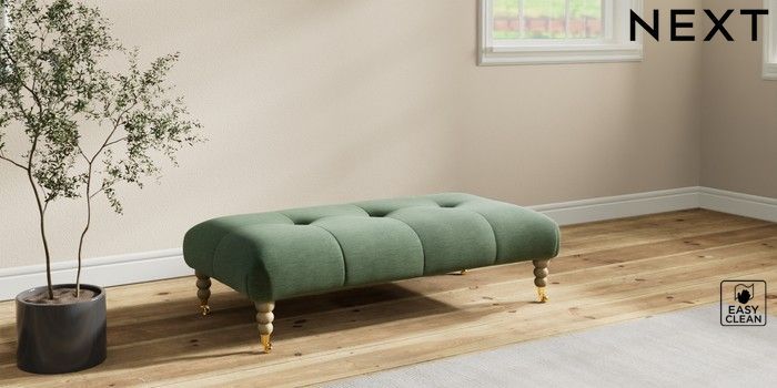 7.2.10 Erin Buttoned Back Deep Relaxed Sit Extra Large Footstool Fine Chenille Easy Clean Mid Khaki Green High Classic Turned Brass Castor - Light | Made Click here to use our website with more accessibility support, for example screen readers