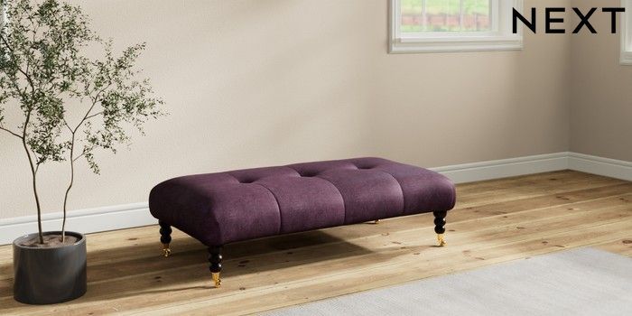 7.2.10 Erin Buttoned Back Deep Relaxed Sit Extra Large Footstool Plush Chenille Dark Plum Purple High Classic Turned Brass Castor - Dark | Made Click here to use our website with more accessibility support, for example screen readers