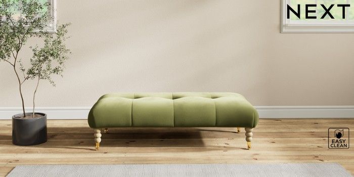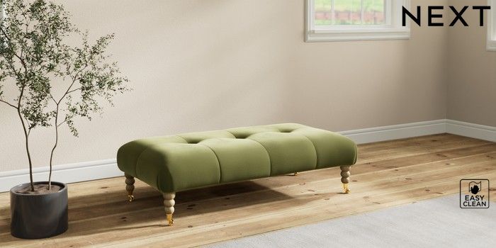 7.2.10 Erin Buttoned Back Deep Relaxed Sit Extra Large Footstool Plush Velvet Easy Clean Mid Olive Green High Classic Turned Brass Castor - Light | Made Click here to use our website with more accessibility support, for example screen readers