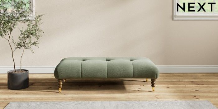 7.2.10 Erin Buttoned Back Deep Relaxed Sit Extra Large Footstool Relaxed Linen Look Dark Green High Classic Turned Brass Castor - Mid | Made Click here to use our website with more accessibility support, for example screen readers