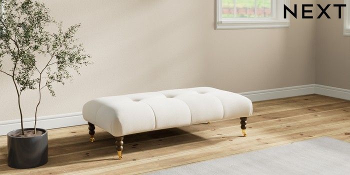 7.2.10 Erin Buttoned Back Deep Relaxed Sit Extra Large Footstool Ripple Chenille Oyster High Classic Turned Brass Castor - Mid | Made Click here to use our website with more accessibility support, for example screen readers
