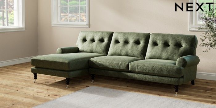 7.2.10 Erin Buttoned Back Deep Relaxed Sit Medium Sofa Chaise - Left Hand Boucle Chenille Dark Moss Green High Classic Turned Chrome Castor - Dark | Made Click here to use our website with more accessibility support, for example screen readers