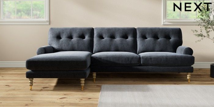 7.2.10 Erin Buttoned Back Deep Relaxed Sit Medium Sofa Chaise - Left Hand Boucle Chenille Dark Slate Blue High Classic Turned Brass Castor - Light | Made Click here to use our website with more accessibility support, for example screen readers