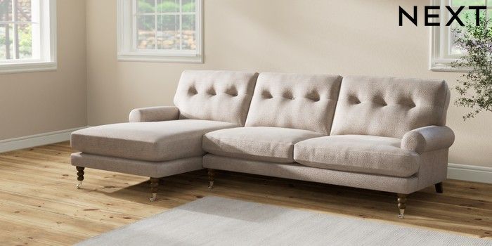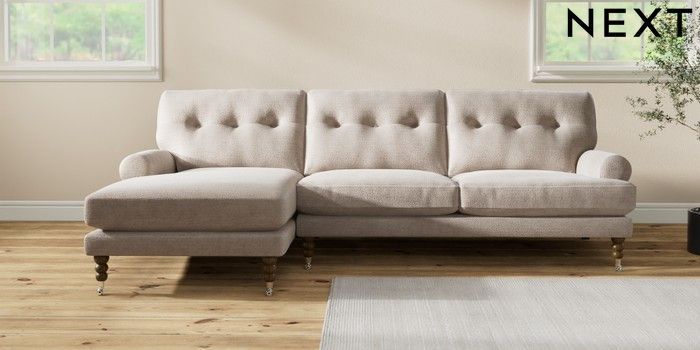 7.2.10 Erin Buttoned Back Deep Relaxed Sit Medium Sofa Chaise - Left Hand Boucle Chenille Light Natural High Classic Turned Chrome Castor - Mid | Made Click here to use our website with more accessibility support, for example screen readers
