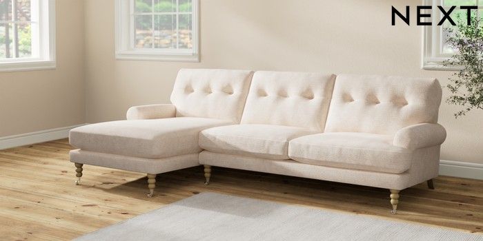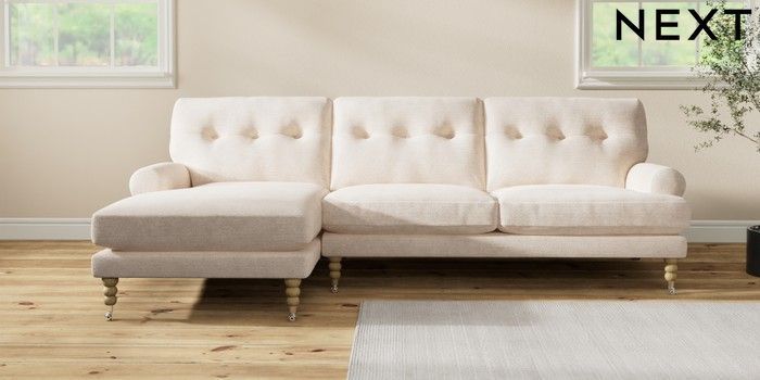 7.2.10 Erin Buttoned Back Deep Relaxed Sit Medium Sofa Chaise - Left Hand Boucle Chenille Oyster High Classic Turned Chrome Castor - Light | Made Click here to use our website with more accessibility support, for example screen readers