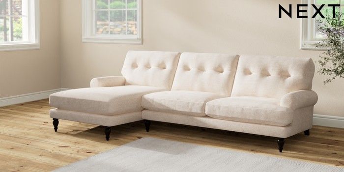 7.2.10 Erin Buttoned Back Deep Relaxed Sit Medium Sofa Chaise - Left Hand Boucle Chenille Oyster High Classic Turned - Dark | Made Click here to use our website with more accessibility support, for example screen readers