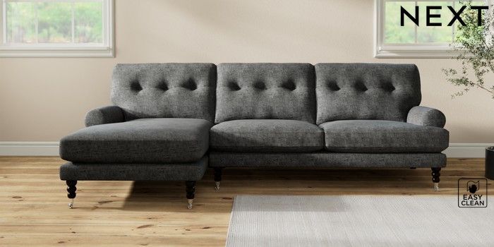 7.2.10 Erin Buttoned Back Deep Relaxed Sit Medium Sofa Chaise - Left Hand Boucle Weave Easy Clean Charcoal Grey High Classic Turned Chrome Castor - Dark | Made Click here to use our website with more accessibility support, for example screen readers