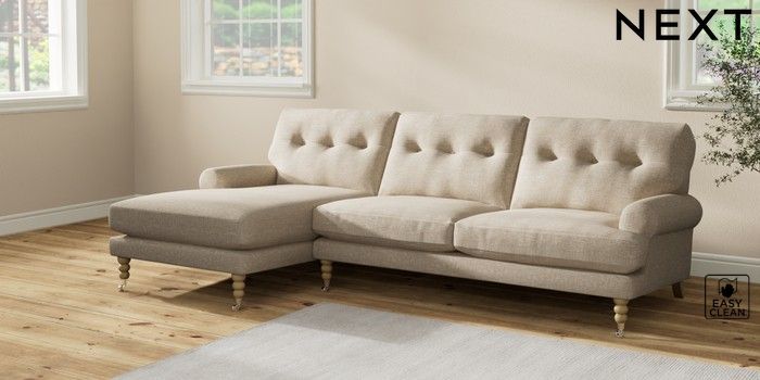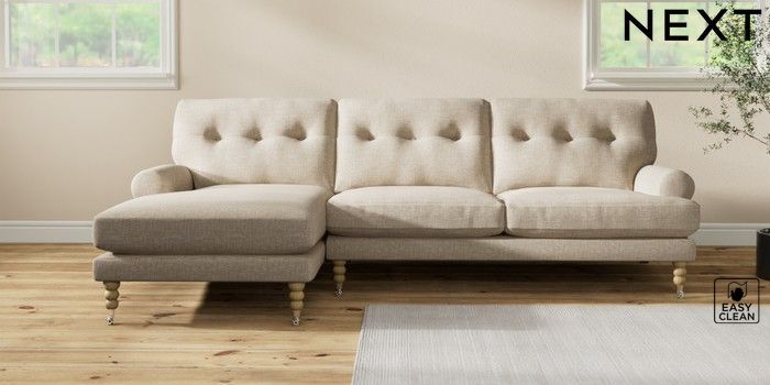 7.2.10 Erin Buttoned Back Deep Relaxed Sit Medium Sofa Chaise - Left Hand Boucle Weave Easy Clean Dark Natural High Classic Turned Chrome Castor - Light | Made Click here to use our website with more accessibility support, for example screen readers
