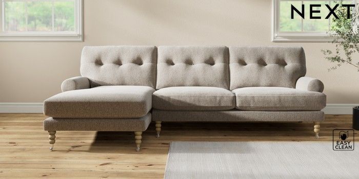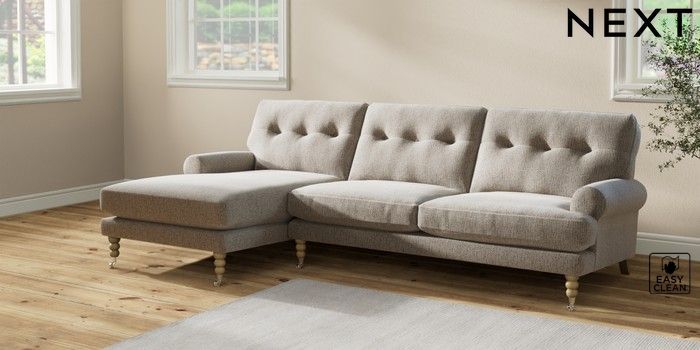 7.2.10 Erin Buttoned Back Deep Relaxed Sit Medium Sofa Chaise - Left Hand Chunky Boucle Easy Clean Dove High Classic Turned Chrome Castor - Light | Made Click here to use our website with more accessibility support, for example screen readers