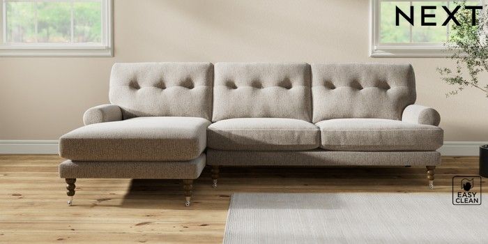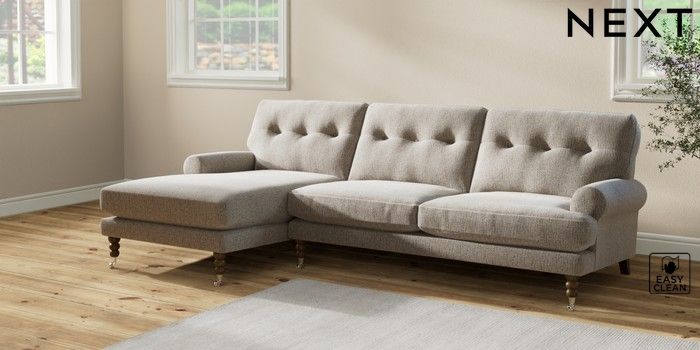 7.2.10 Erin Buttoned Back Deep Relaxed Sit Medium Sofa Chaise - Left Hand Chunky Boucle Easy Clean Dove High Classic Turned Chrome Castor - Mid | Made Click here to use our website with more accessibility support, for example screen readers