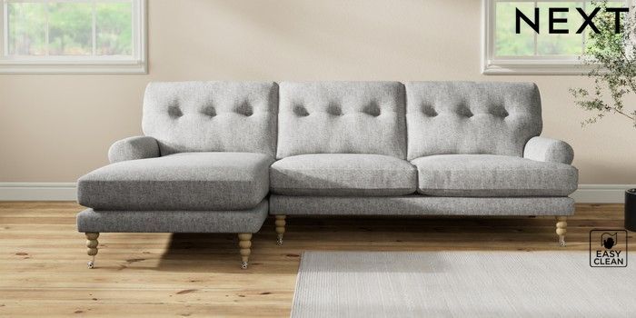 7.2.10 Erin Buttoned Back Deep Relaxed Sit Medium Sofa Chaise - Left Hand Chunky Boucle Easy Clean Light Grey High Classic Turned Chrome Castor - Light | Made Click here to use our website with more accessibility support, for example screen readers