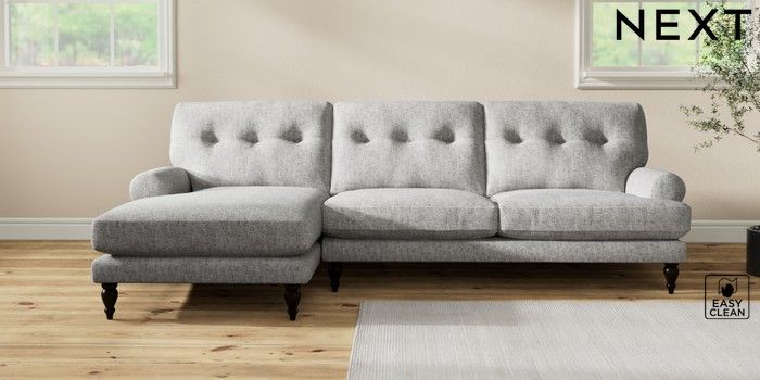 7.2.10 Erin Buttoned Back Deep Relaxed Sit Medium Sofa Chaise - Left Hand Chunky Boucle Easy Clean Light Grey High Classic Turned - Dark | Made Click here to use our website with more accessibility support, for example screen readers