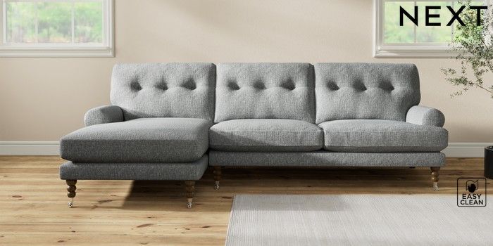 7.2.10 Erin Buttoned Back Deep Relaxed Sit Medium Sofa Chaise - Left Hand Chunky Boucle Easy Clean Mid Grey High Classic Turned Chrome Castor - Mid | Made Click here to use our website with more accessibility support, for example screen readers