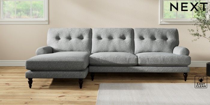 7.2.10 Erin Buttoned Back Deep Relaxed Sit Medium Sofa Chaise - Left Hand Chunky Boucle Easy Clean Mid Grey High Classic Turned - Dark | Made Click here to use our website with more accessibility support, for example screen readers