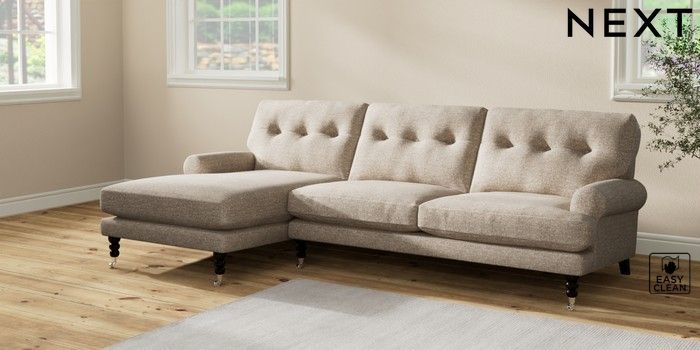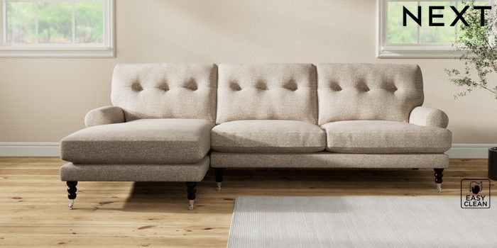 7.2.10 Erin Buttoned Back Deep Relaxed Sit Medium Sofa Chaise - Left Hand Chunky Boucle Easy Clean Mid Natural High Classic Turned Chrome Castor - Dark | Made Click here to use our website with more accessibility support, for example screen readers