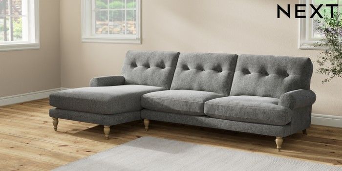 7.2.10 Erin Buttoned Back Deep Relaxed Sit Medium Sofa Chaise - Left Hand Chunky Chenille Dark Grey High Classic Turned - Light | Made Click here to use our website with more accessibility support, for example screen readers