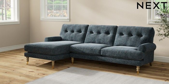 7.2.10 Erin Buttoned Back Deep Relaxed Sit Medium Sofa Chaise - Left Hand Chunky Chenille Dark Navy Blue High Classic Turned Brass Castor - Light | Made Click here to use our website with more accessibility support, for example screen readers