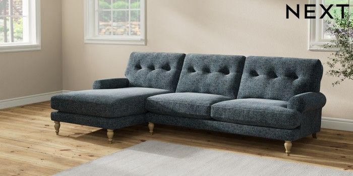 7.2.10 Erin Buttoned Back Deep Relaxed Sit Medium Sofa Chaise - Left Hand Chunky Chenille Dark Navy Blue High Classic Turned - Light | Made Click here to use our website with more accessibility support, for example screen readers