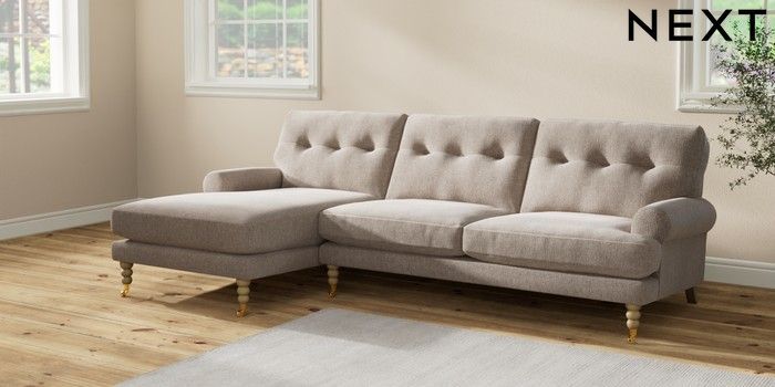 7.2.10 Erin Buttoned Back Deep Relaxed Sit Medium Sofa Chaise - Left Hand Chunky Chenille Light Dove High Classic Turned Brass Castor - Light | Made Click here to use our website with more accessibility support, for example screen readers