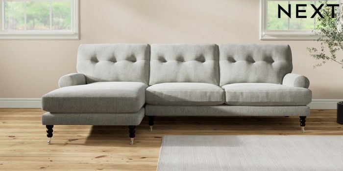 7.2.10 Erin Buttoned Back Deep Relaxed Sit Medium Sofa Chaise - Left Hand Chunky Chenille Light Grey High Classic Turned Chrome Castor - Dark | Made Click here to use our website with more accessibility support, for example screen readers