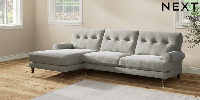 7.2.10 Erin Buttoned Back Deep Relaxed Sit Medium Sofa Chaise - Left Hand Chunky Chenille Light Grey High Classic Turned Chrome Castor - Mid | Made Click here to use our website with more accessibility support, for example screen readers