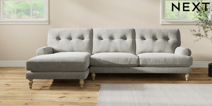 7.2.10 Erin Buttoned Back Deep Relaxed Sit Medium Sofa Chaise - Left Hand Chunky Chenille Light Grey High Classic Turned - Light | Made Click here to use our website with more accessibility support, for example screen readers