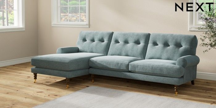 7.2.10 Erin Buttoned Back Deep Relaxed Sit Medium Sofa Chaise - Left Hand Chunky Chenille Light Teal Green High Classic Turned Brass Castor - Mid | Made Click here to use our website with more accessibility support, for example screen readers
