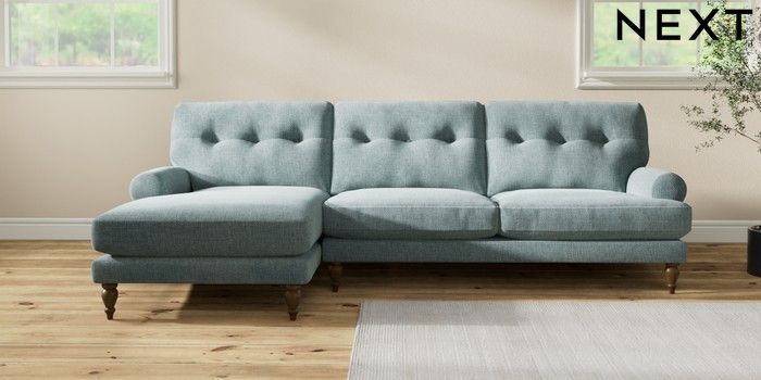 7.2.10 Erin Buttoned Back Deep Relaxed Sit Medium Sofa Chaise - Left Hand Chunky Chenille Light Teal Green High Classic Turned - Mid | Made Click here to use our website with more accessibility support, for example screen readers