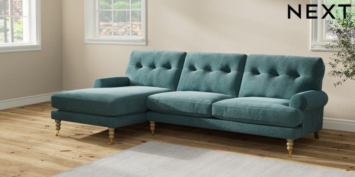 7.2.10 Erin Buttoned Back Deep Relaxed Sit Medium Sofa Chaise - Left Hand Chunky Chenille Mid Teal Green High Classic Turned Brass Castor - Light | Made Click here to use our website with more accessibility support, for example screen readers
