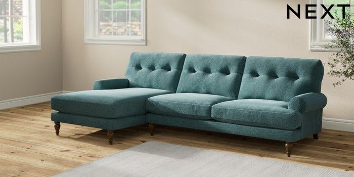 7.2.10 Erin Buttoned Back Deep Relaxed Sit Medium Sofa Chaise - Left Hand Chunky Chenille Mid Teal Green High Classic Turned - Mid | Made Click here to use our website with more accessibility support, for example screen readers