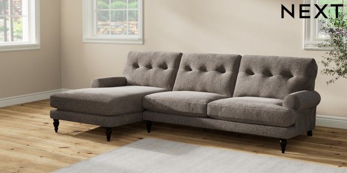 7.2.10 Erin Buttoned Back Deep Relaxed Sit Medium Sofa Chaise - Left Hand Chunky Chenille Mink Brown High Classic Turned - Dark | Made Click here to use our website with more accessibility support, for example screen readers