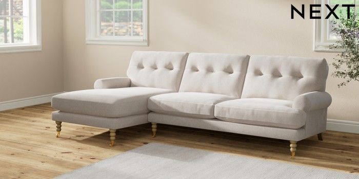 7.2.10 Erin Buttoned Back Deep Relaxed Sit Medium Sofa Chaise - Left Hand Chunky Chenille Oyster High Classic Turned Brass Castor - Light | Made Click here to use our website with more accessibility support, for example screen readers
