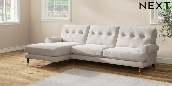 7.2.10 Erin Buttoned Back Deep Relaxed Sit Medium Sofa Chaise - Left Hand Chunky Chenille Oyster High Classic Turned Brass Castor - Mid | Made Click here to use our website with more accessibility support, for example screen readers