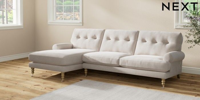 7.2.10 Erin Buttoned Back Deep Relaxed Sit Medium Sofa Chaise - Left Hand Chunky Chenille Oyster High Classic Turned Chrome Castor - Light | Made Click here to use our website with more accessibility support, for example screen readers