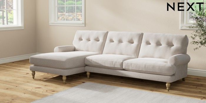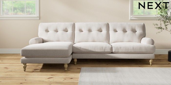 7.2.10 Erin Buttoned Back Deep Relaxed Sit Medium Sofa Chaise - Left Hand Chunky Chenille Oyster High Classic Turned - Light | Made Click here to use our website with more accessibility support, for example screen readers
