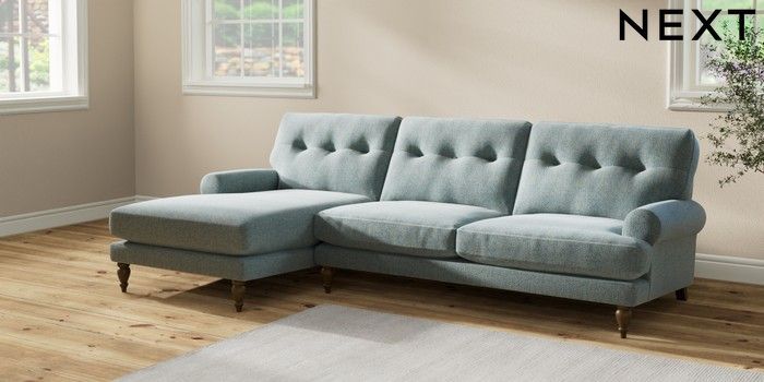 7.2.10 Erin Buttoned Back Deep Relaxed Sit Medium Sofa Chaise - Left Hand Chunky Marl Mid Blue High Classic Turned - Mid | Made Click here to use our website with more accessibility support, for example screen readers