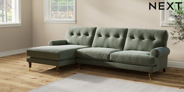 7.2.10 Erin Buttoned Back Deep Relaxed Sit Medium Sofa Chaise - Left Hand Chunky Texture Mid Forest Green High Classic Turned Brass Castor - Mid | Made Click here to use our website with more accessibility support, for example screen readers