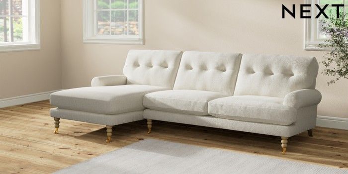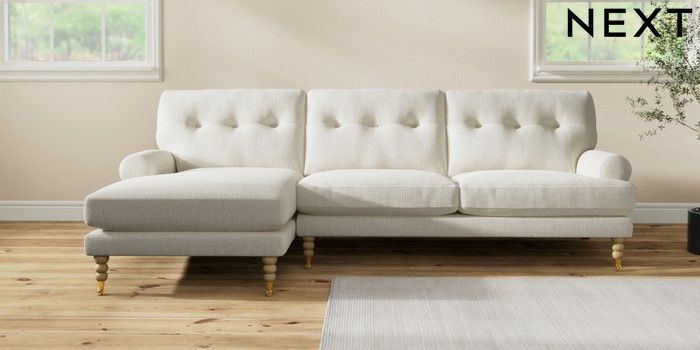 7.2.10 Erin Buttoned Back Deep Relaxed Sit Medium Sofa Chaise - Left Hand Chunky Texture Oyster High Classic Turned Brass Castor - Light | Made Click here to use our website with more accessibility support, for example screen readers
