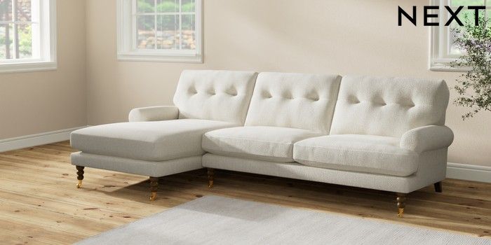 7.2.10 Erin Buttoned Back Deep Relaxed Sit Medium Sofa Chaise - Left Hand Chunky Texture Oyster High Classic Turned Brass Castor - Mid | Made Click here to use our website with more accessibility support, for example screen readers