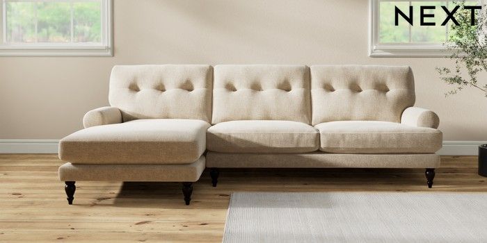 7.2.10 Erin Buttoned Back Deep Relaxed Sit Medium Sofa Chaise - Left Hand Chunky Weave Cream High Classic Turned - Dark | Made Click here to use our website with more accessibility support, for example screen readers