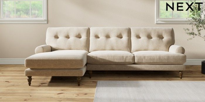 7.2.10 Erin Buttoned Back Deep Relaxed Sit Medium Sofa Chaise - Left Hand Chunky Weave Cream High Classic Turned - Mid | Made Click here to use our website with more accessibility support, for example screen readers