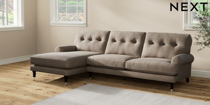 7.2.10 Erin Buttoned Back Deep Relaxed Sit Medium Sofa Chaise - Left Hand Chunky Weave Dark Natural High Classic Turned Chrome Castor - Dark | Made Click here to use our website with more accessibility support, for example screen readers