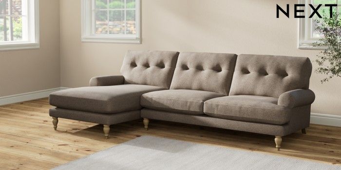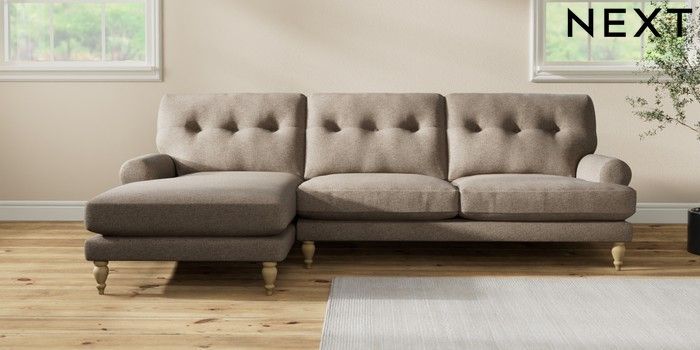 7.2.10 Erin Buttoned Back Deep Relaxed Sit Medium Sofa Chaise - Left Hand Chunky Weave Dark Natural High Classic Turned - Light | Made Click here to use our website with more accessibility support, for example screen readers