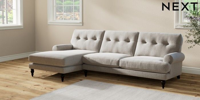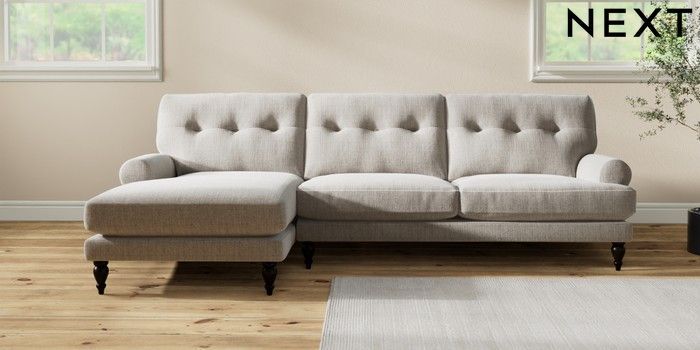 7.2.10 Erin Buttoned Back Deep Relaxed Sit Medium Sofa Chaise - Left Hand Chunky Weave Dove Grey High Classic Turned - Dark | Made Click here to use our website with more accessibility support, for example screen readers