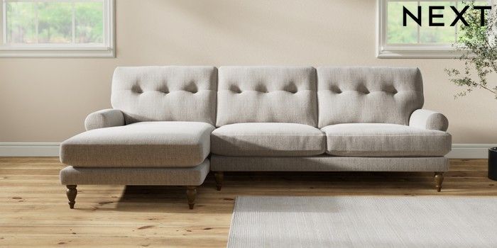 7.2.10 Erin Buttoned Back Deep Relaxed Sit Medium Sofa Chaise - Left Hand Chunky Weave Dove Grey High Classic Turned - Mid | Made Click here to use our website with more accessibility support, for example screen readers