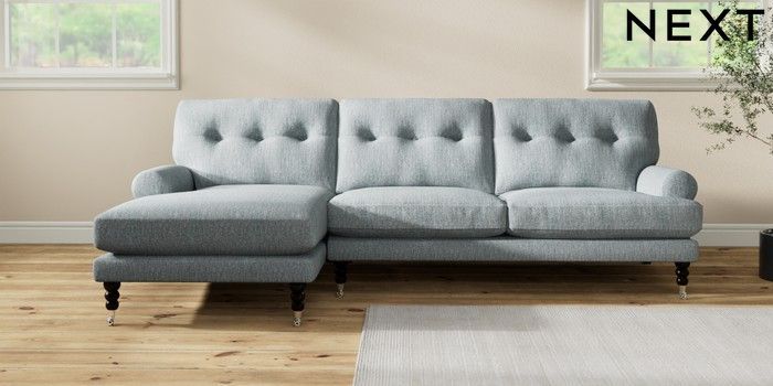 7.2.10 Erin Buttoned Back Deep Relaxed Sit Medium Sofa Chaise - Left Hand Chunky Weave Mid Blue High Classic Turned Chrome Castor - Dark | Made Click here to use our website with more accessibility support, for example screen readers