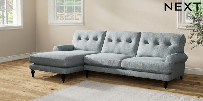 7.2.10 Erin Buttoned Back Deep Relaxed Sit Medium Sofa Chaise - Left Hand Chunky Weave Mid Blue High Classic Turned - Dark | Made Click here to use our website with more accessibility support, for example screen readers