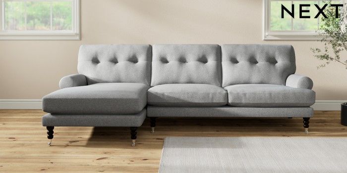 7.2.10 Erin Buttoned Back Deep Relaxed Sit Medium Sofa Chaise - Left Hand Chunky Weave Mid Grey High Classic Turned Chrome Castor - Dark | Made Click here to use our website with more accessibility support, for example screen readers